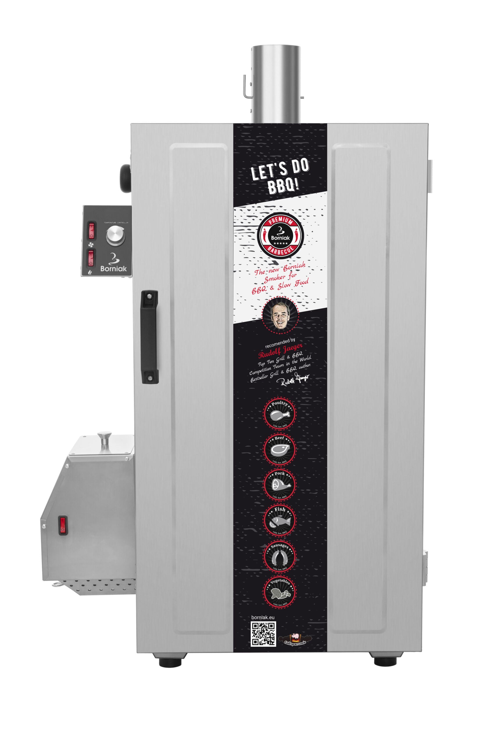 \n*** Just nu beställningsvara. Leveranstid upp till 10 dagar *** \nNyaste modellen (version 1.4) från Borniak. \nVärstingskåpet från Borniak. Digital PID-styrning och helt i rostfritt både ut- och invändigt. Dessutom utrustat med extra hög effekt på hela 1115 W. \nDetta gör att man kan komma upp i en temperatur på 150 grader samt klarar av att värma ordentligt även mitt i smällkalla vintern. \nI köpet ingår skåpet, rökgenerator, 1 rostfritt hyllplan, 3 stänger att hänga krokar i samt några 2-liters spånpåsar. D.v.s. allt man behöver. \nDu har möjlighet att köpa till ytterligare 6 hyllplan, krokar att hänga mat i, kallrökningsenhet, fläkt för lufttorkning, hjul att montera under för smidigare förflyttning, väderskydd m.m.Couldn't load pickup availability