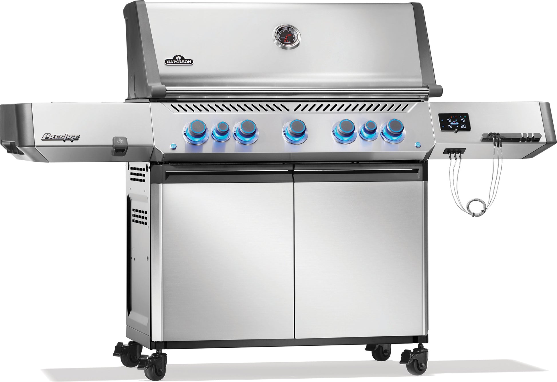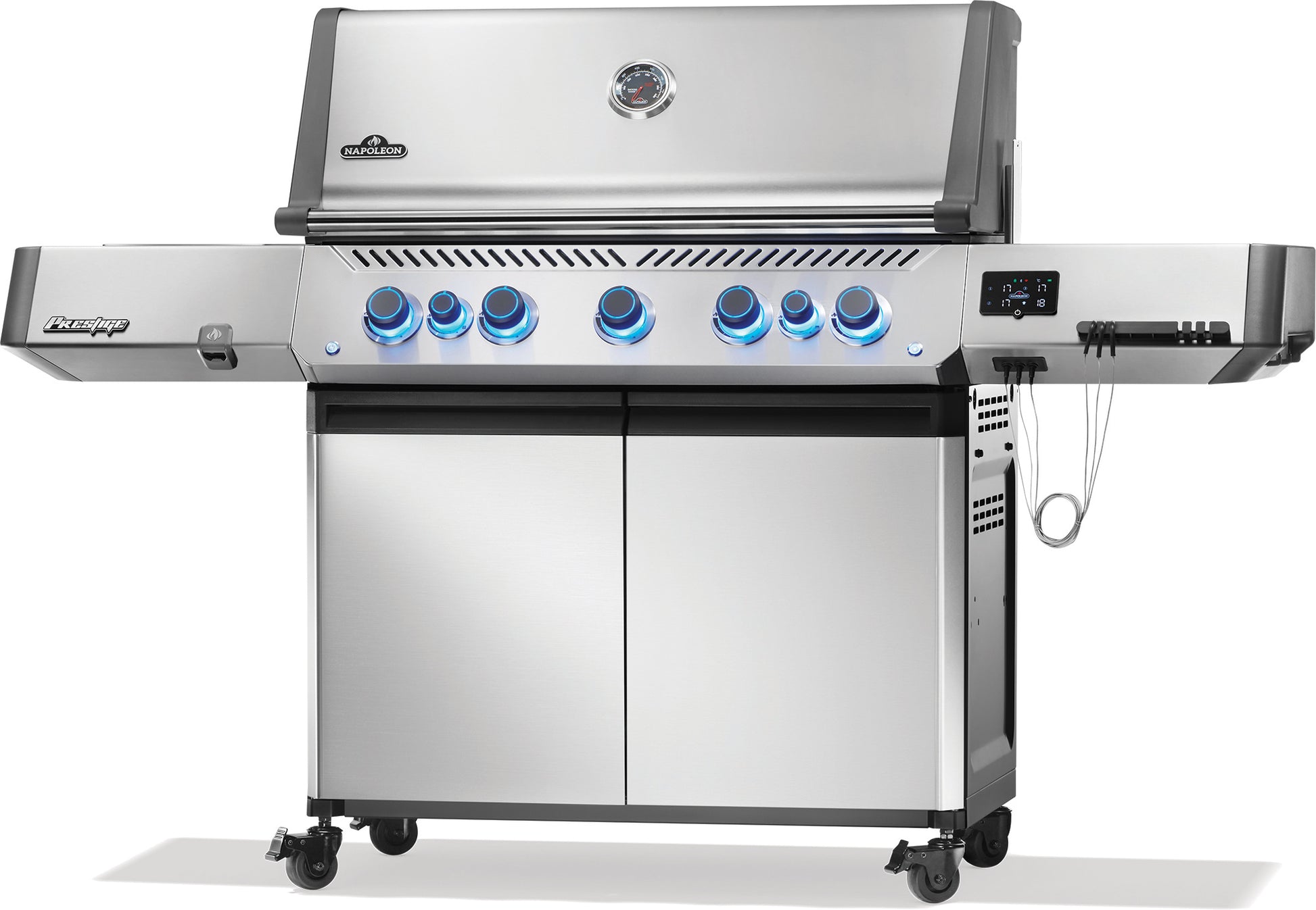 Prestige® 665 Connected är en del av Napoleons unika Connected-serie, vilket innebär att grillen har några unika teknologiska fördelar. På sidobordet finns en integrerad LCD-skärm och medföljande stektermometrar, så att du enkelt kan övervaka innertemperaturen på ditt kött. Inuti grillen finns även temperaturmätare vid grillgallret, vilket hjälper dig att få en exakt överblick över grillens temperatur. Connected-teknologin inkluderar även Bluetooth, så att du kan följa med i din matlagning via en app på din telefon. I appen kan du även ställa in timers och larm när du grillar, samt få massor av användbara grilltips. En annan praktisk funktion är grillens gasflaskemätare, som ger dig en exakt överblick över hur mycket gas som finns kvar i gasflaskan.