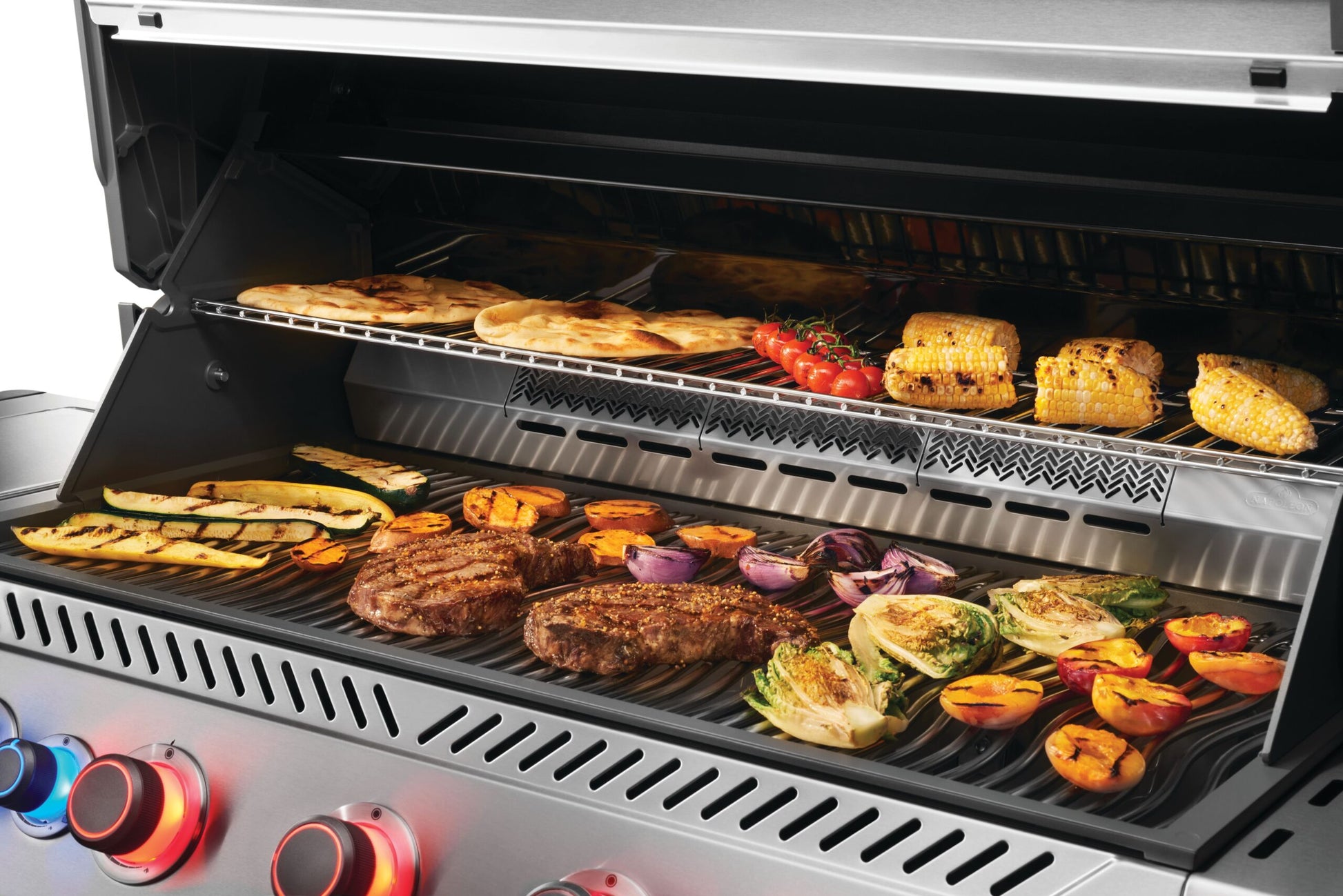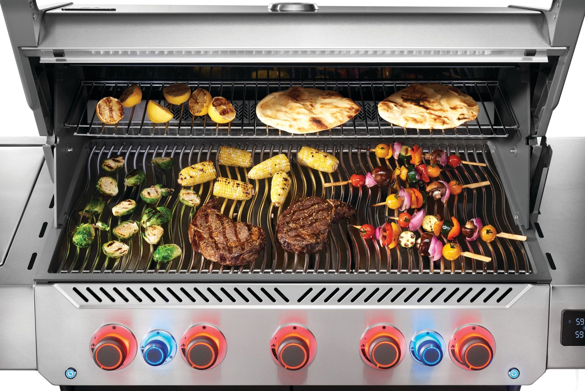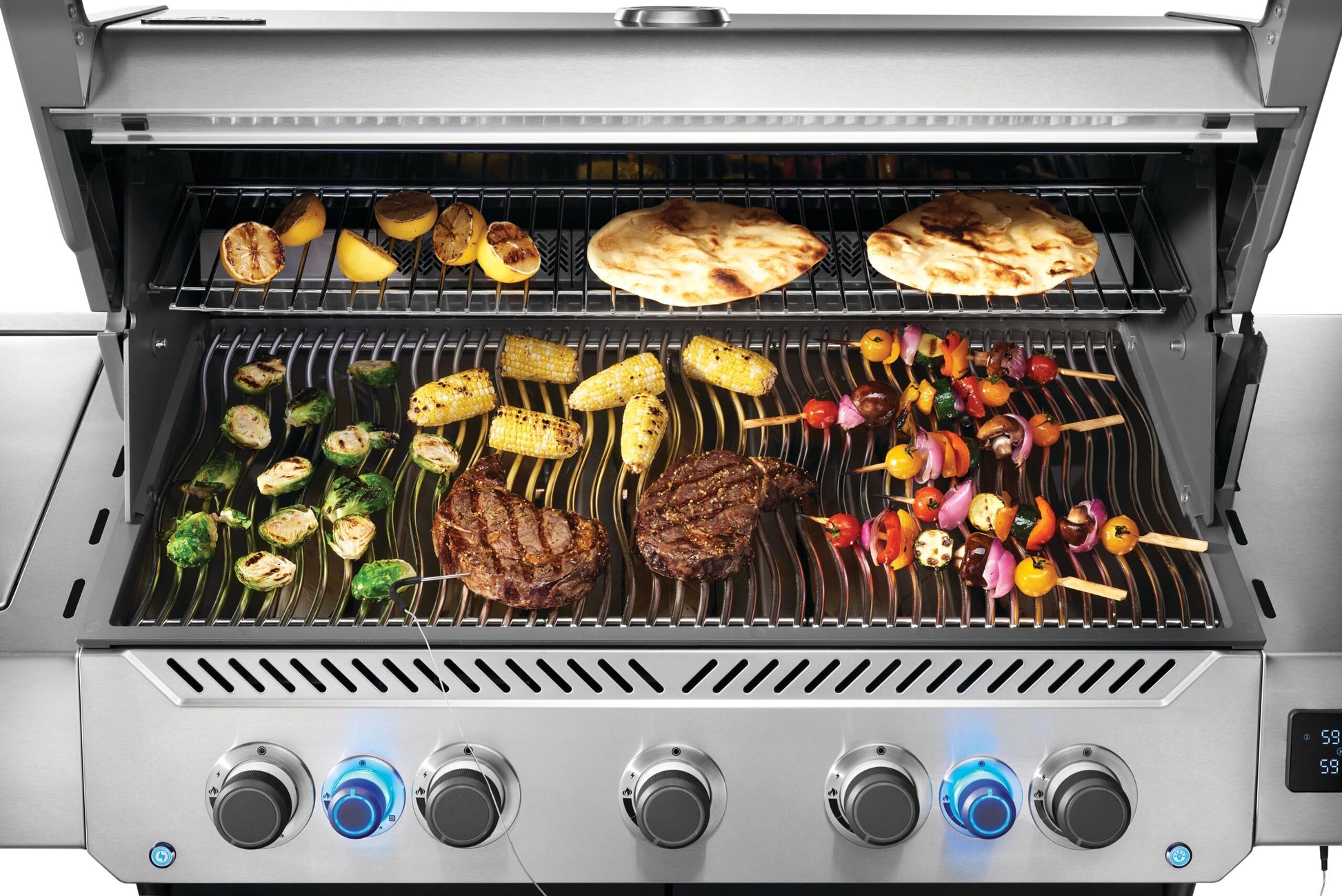 Det primära grillområdet är hela 94 x 46 cm, och de fem huvudbrännarna ger massor av möjligheter att prova olika grillmetoder. Brännarna tänds med det pålitliga JETFIRE™-tändsystemet, som har uppgraderats till en ny och optimerad 2.0-version i Prestige® Connected. Grillgallren är tillverkade av rostfritt 304-stål, vilket ger lång hållbarhet och enkel rengöring – grillgaller i rostfritt stål kan nämligen diskas i diskmaskin.