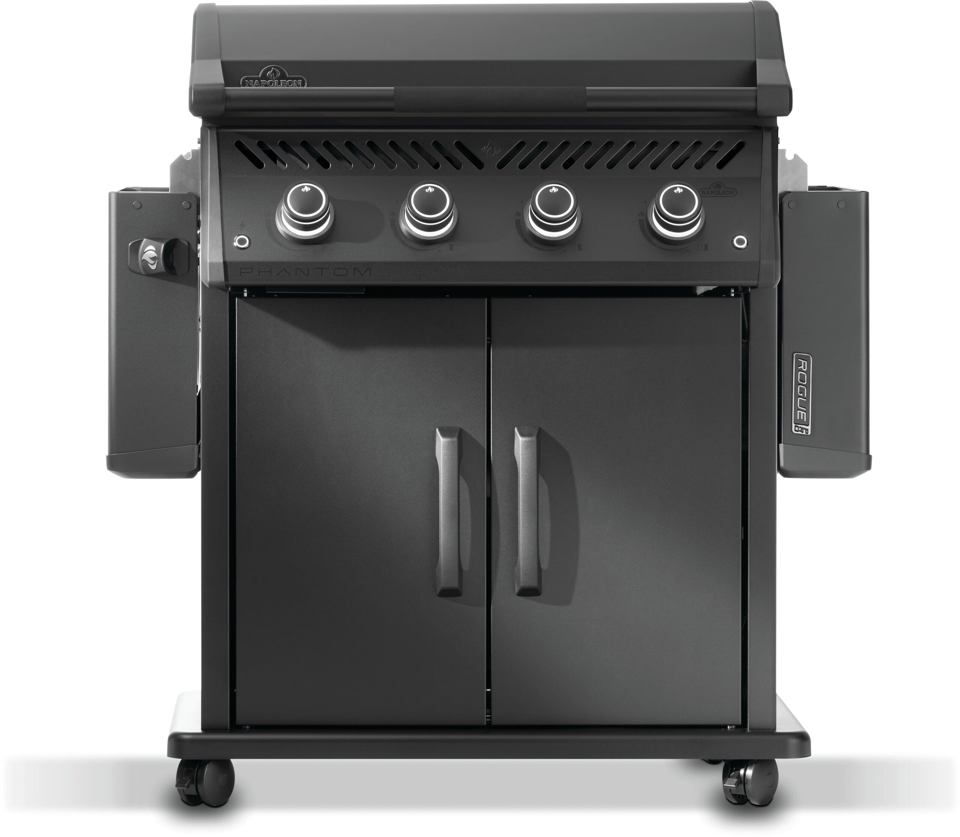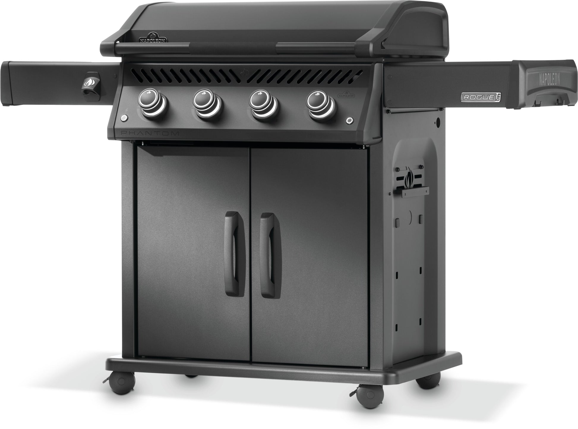 Den mattsvarta Phantom-designen gör grillen till en stilfull blickfångare, men även funktionerna imponerar: LED-belysta reglage, fällbara sidobord med integrerad kapsylöppnare, en stor droppbricka och lättrullande hjul för enkel förflyttning. En smart detalj är den avtagbara förvaringslådan i vänstra sidobordet – perfekt för förberedelser eller som multifunktionell förvaring.