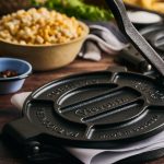 \nDenna hållbara press för tacos och burritos har ett ergonomiskt böjt handtag som hjälper dig att skapa den perfekta tortillastorleken varje gång. Pressen är förinstekt med 100 % icke-GMO, kosher-certifierad linfröolja. Dessutom har den en texturerad, specialbehandlad yta som behåller ytan bättre än andra pressar – utan att kännas ojämn eller knottrig.