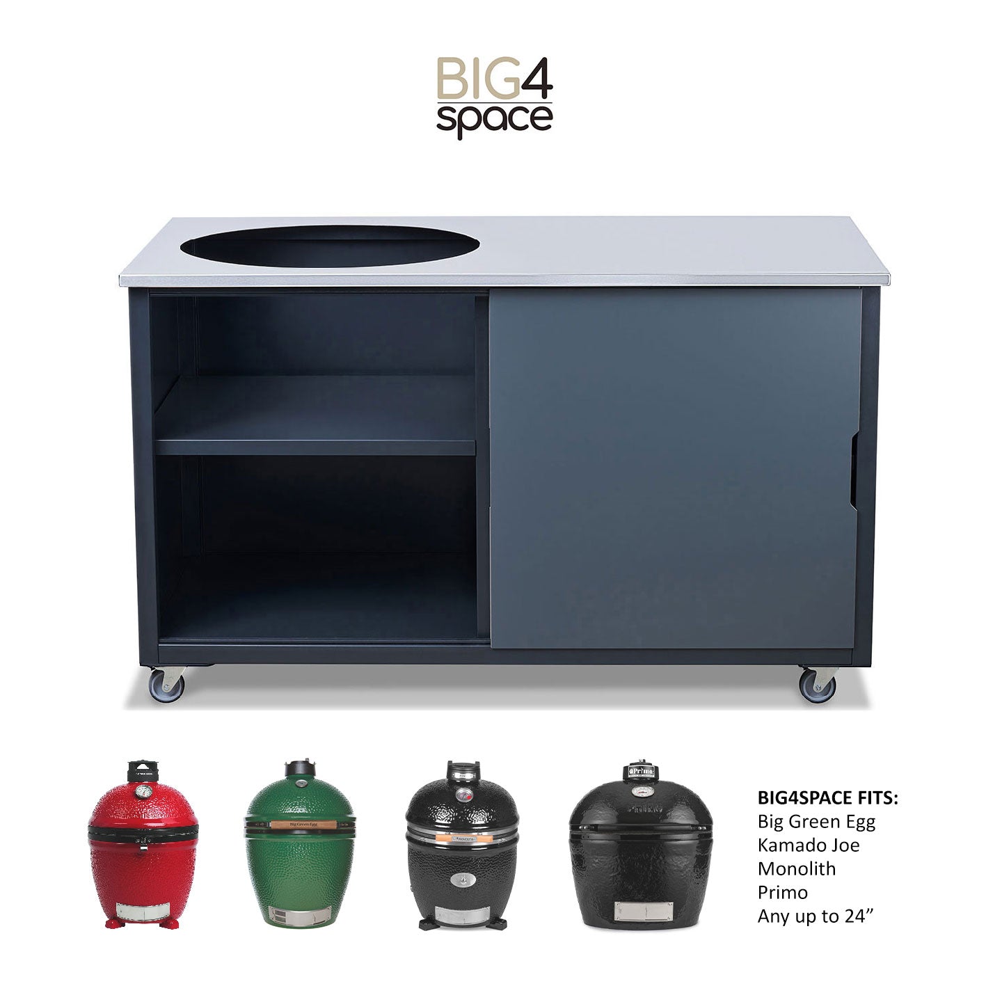 Fits Big Green Egg large, Kamado Joe classic, Primo LG300, Monolith classic, and many more kamado grills. If you are looking for Kamado Joe table, Big Green Egg table, Kamado Bono table or any other Kamado grill table, BIG4SPACE is the best solution.
