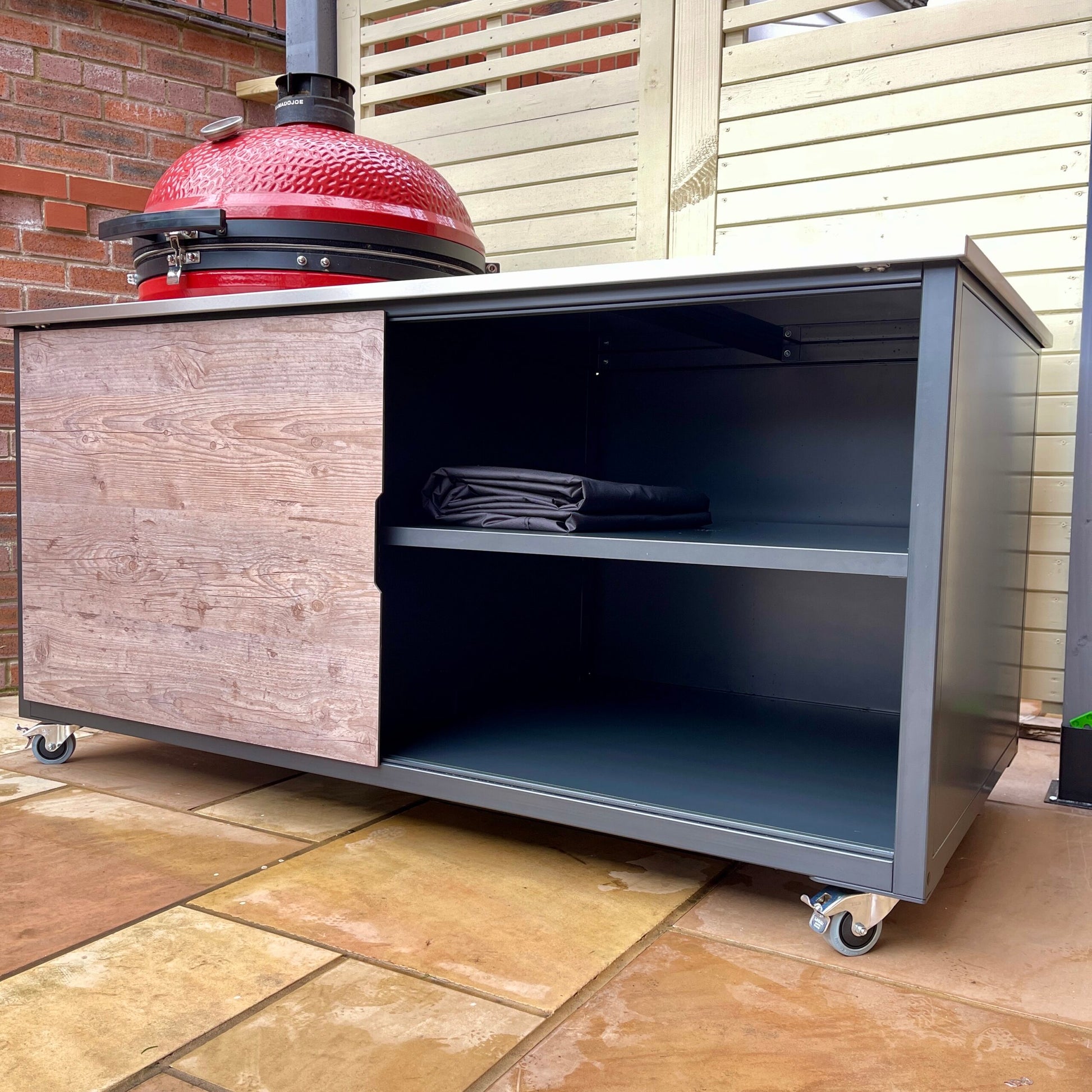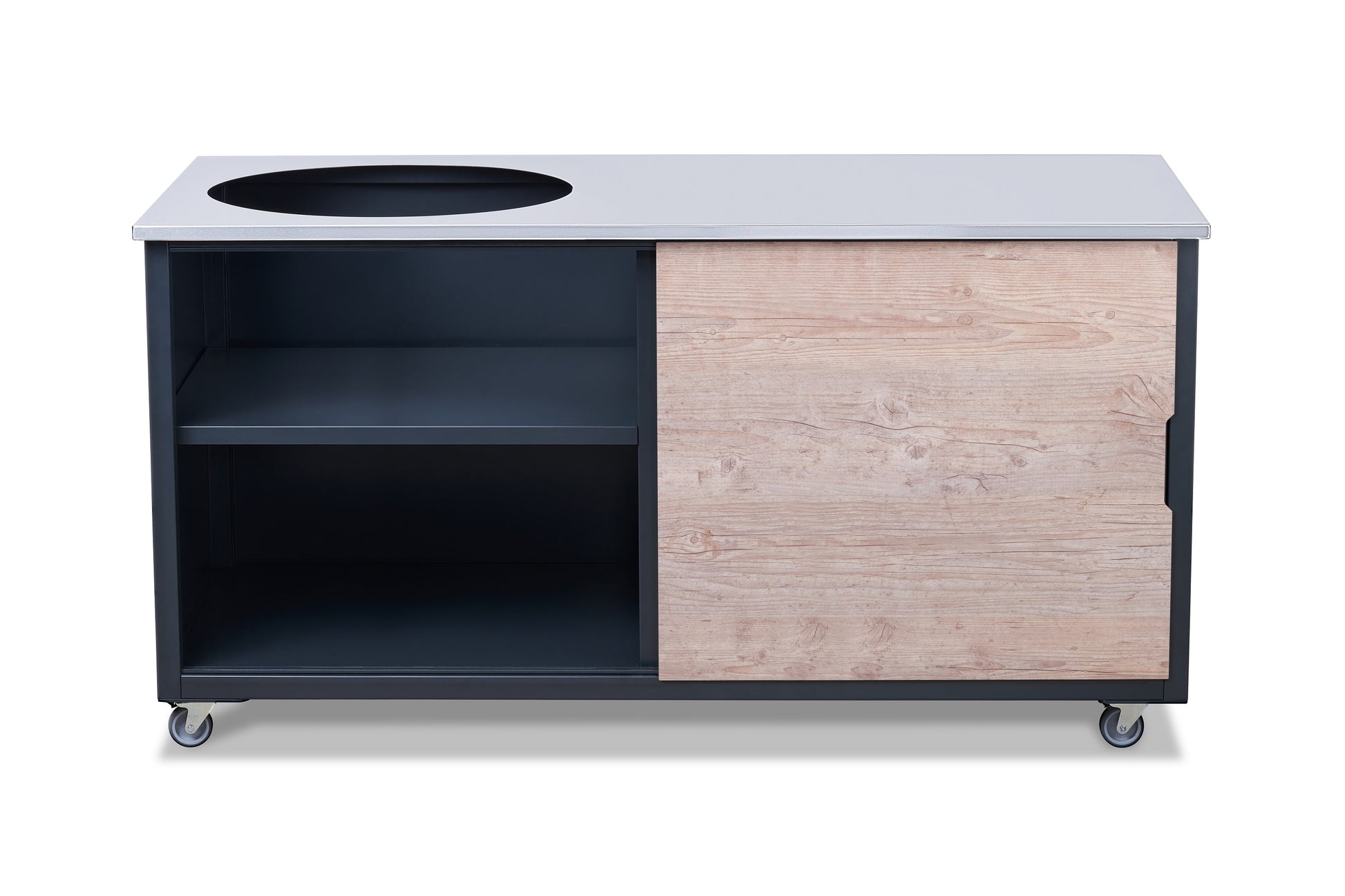 The worktop is made of carefully polished, acid-proof food grade stainless steel that is resistant to heat and is easy to clean and maintain. The precise opening in the worktop is laser cut and grill stand shelf can be adjusted in 30 mm increments (7 positions) to fit your specific kamado grill model.