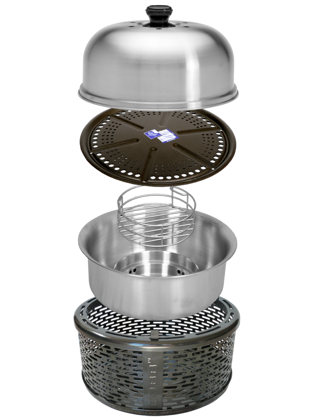 \nAllmän information: \nBekväm och enkel att använda. 8-10 briketter, kolbitar eller COBB CobbleStone lagar nästan vad som helst \nVerkligen portabel, använd den nästan var som helst \nHälsosam matlagning utan uppblossande flammor \nSäker att hantera - basen förblir sval under matlagningen \nTillverkad av rostfritt stål/mildstål - alla delar tål maskindisk, utom den pulverlackerade basen som bara behöver torkas av \nGaranterad kvalitet - 2 års garanti \nVinnare av flera designpriser \n \nPaketet innehåller: \nPulverlackerad basenhet i mildstål \nInnerskål och eldkorg i rostfritt stål \nTeflon™-belagd grillplatta för allmänt bruk \nKupol i rostfritt stål \nLyfthandtag för allmänt bruk