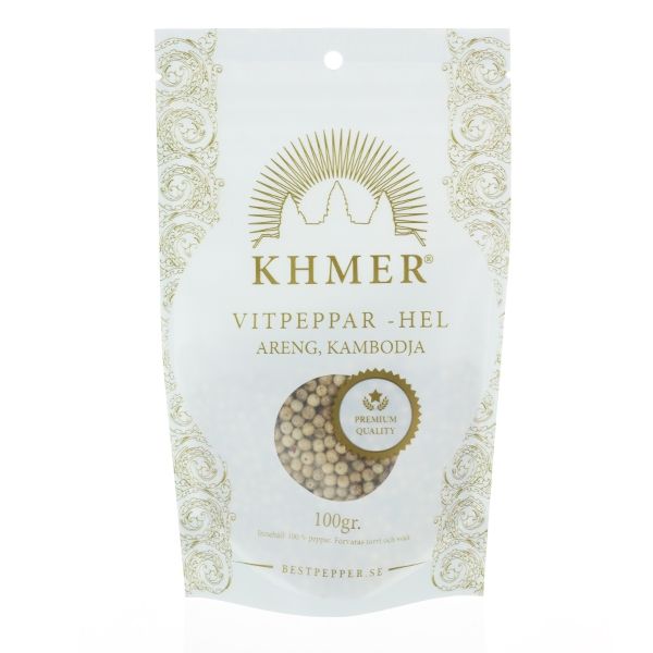 \nPeppar producerat av Khmer anses av många tillhöra världens bästa peppar. Denna vitpeppar ger en fräsch smak som passar extra bra till fiskrätter men egentligen till den mesta matlagning. \n \nProva gärna att mixa med med Khmer rödpeppar, det blir en riktigt bra kombo. \n \nDenna påsen innehåller hela pepparkorn och väger 100 gramKunde inte ladda upphämtningstillgänglighet