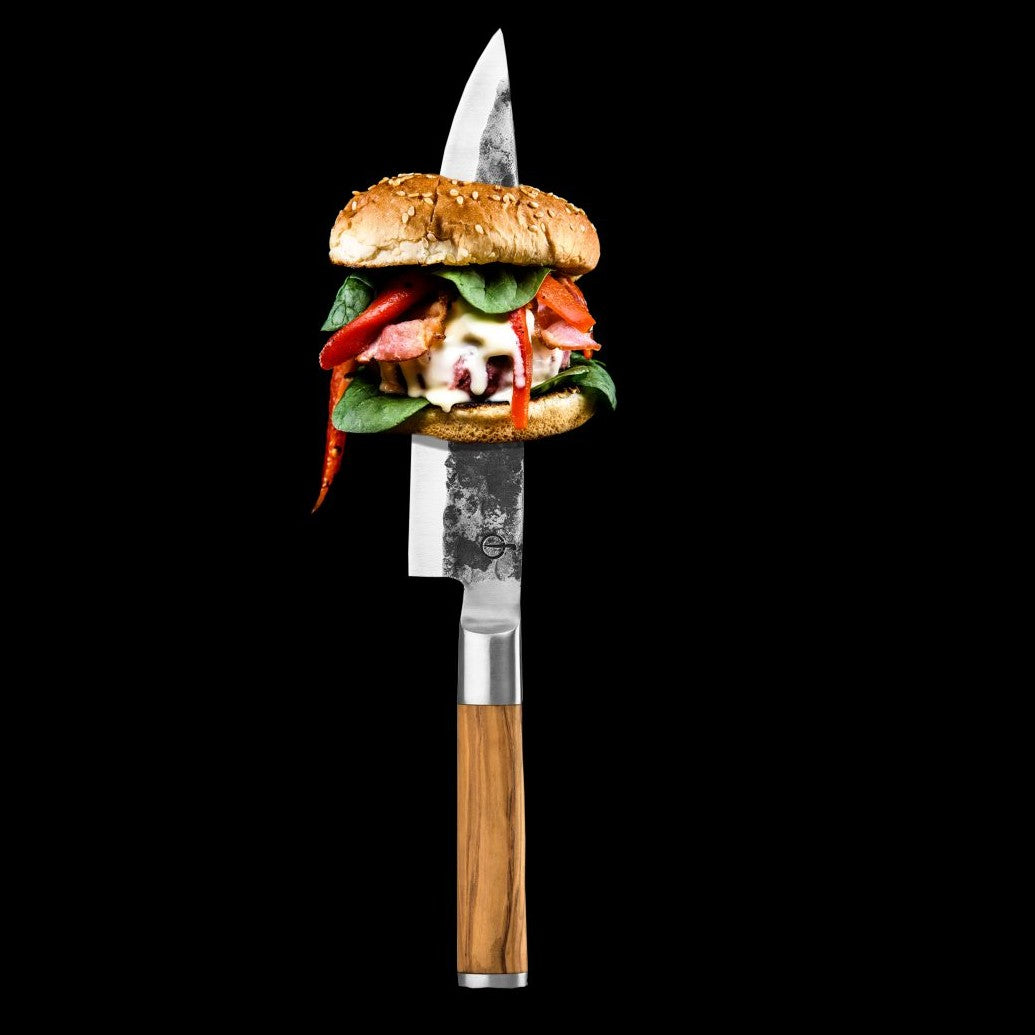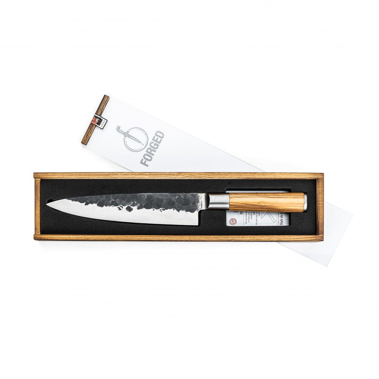 Den mest mångsidiga kniven i köket och oumbärlig för varje (amatör) kock. Praktiskt för att skära kött, fisk eller grönsaker men också perfekt för att finhacka örter. Formen på bladet på Forged Olive kockkniv är typisk för det europeiska köket. Forged Olive-knivarna är tillverkade av japanskt 440C-stål med en hårdhetsgrad på 58 Rockwell. Alla Forged knivar är smidda för hand, har en bladtjocklek på 2 mm och en 18-graders skärvinkel. Kommer i en lyxig låda. Vi lämnar 10 års garanti.