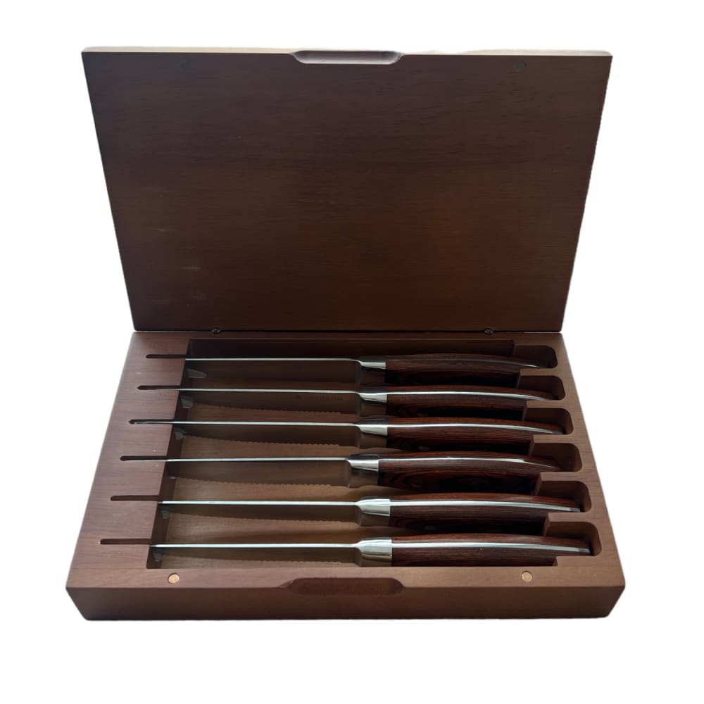 En uppsättning med sex knivar i rostfritt stål i en vacker trälåda. Det här stilfulla setet kommer att se bra ut i vilket kök som helst. Levereras förpackat i en presentförpackning.