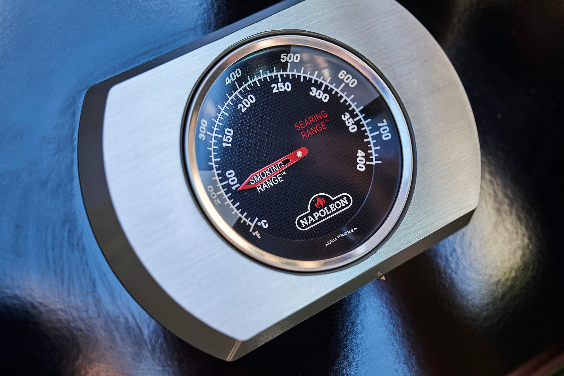 Napoleon® Rogue® 525 är en grill som kombinerar hög kvalitet med banbrytande design. Den eleganta, helsvarta exteriören imponerar direkt, men det är detaljerna som gör denna grill till ett premiumval. Rogue® 525 har en aluminiumgjuten balja som är enkel att rengöra och utrustad med Napoleons® patenterade droppskydd för jämn temperaturfördelning. Dessutom ingår brännare i rostfritt stål, det pålitliga JETFIRE™-tändsystemet, den precisa ACCU-PROBE™-termometern i locket samt en dropplåt med frontåtkomst.