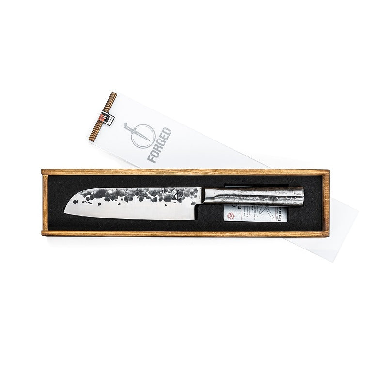 \nForged Intense Santoku-kniven 18 cm är den japanska versionen av kockkniven. Ordet "santoku" betyder "tre dygder", en hänvisning till de tre skärfunktioner som kniven kan utföra: skiva, tärna och hacka. Denna mångfald gör den till en allroundare i köket. Forged Intense-knivarna är tillverkade av japanskt 440C-stål med en hårdhetsgrad på 58 Rockwell. Alla Forged knivar är smidda för hand, har en bladtjocklek på 2 mm och en 18-graders skärvinkel. Kommer i en lyxig låda. Vi ger en 10-årsperiod