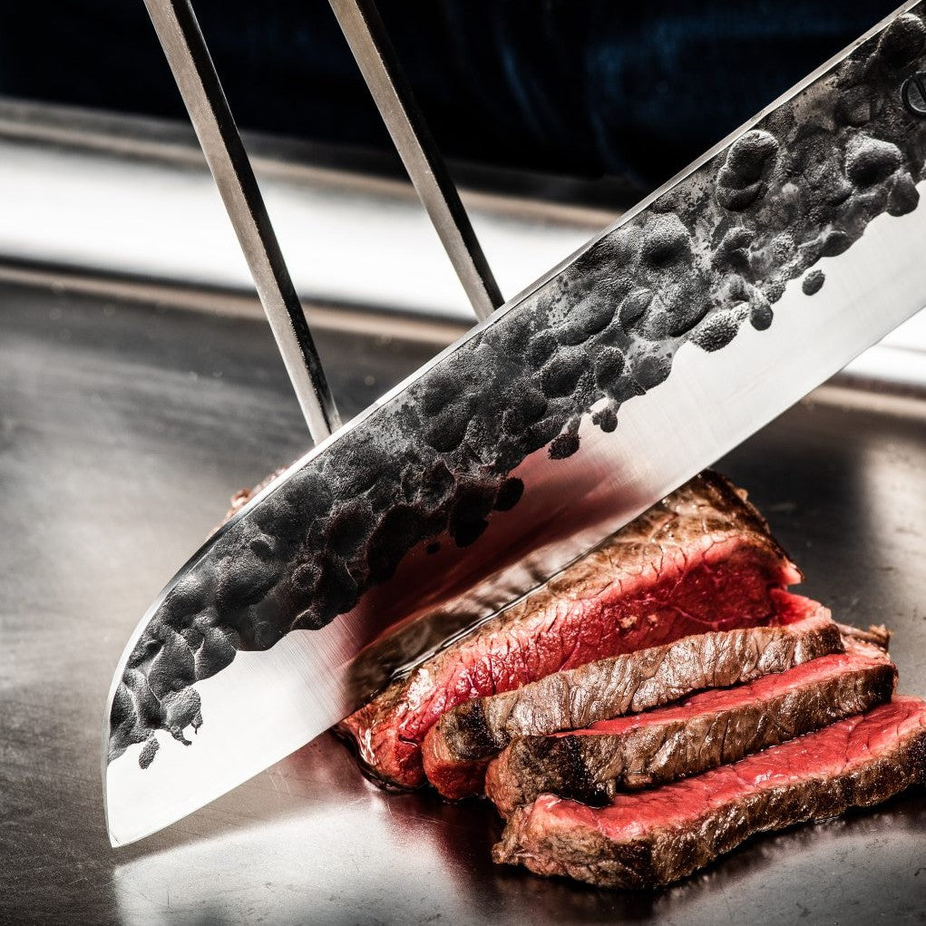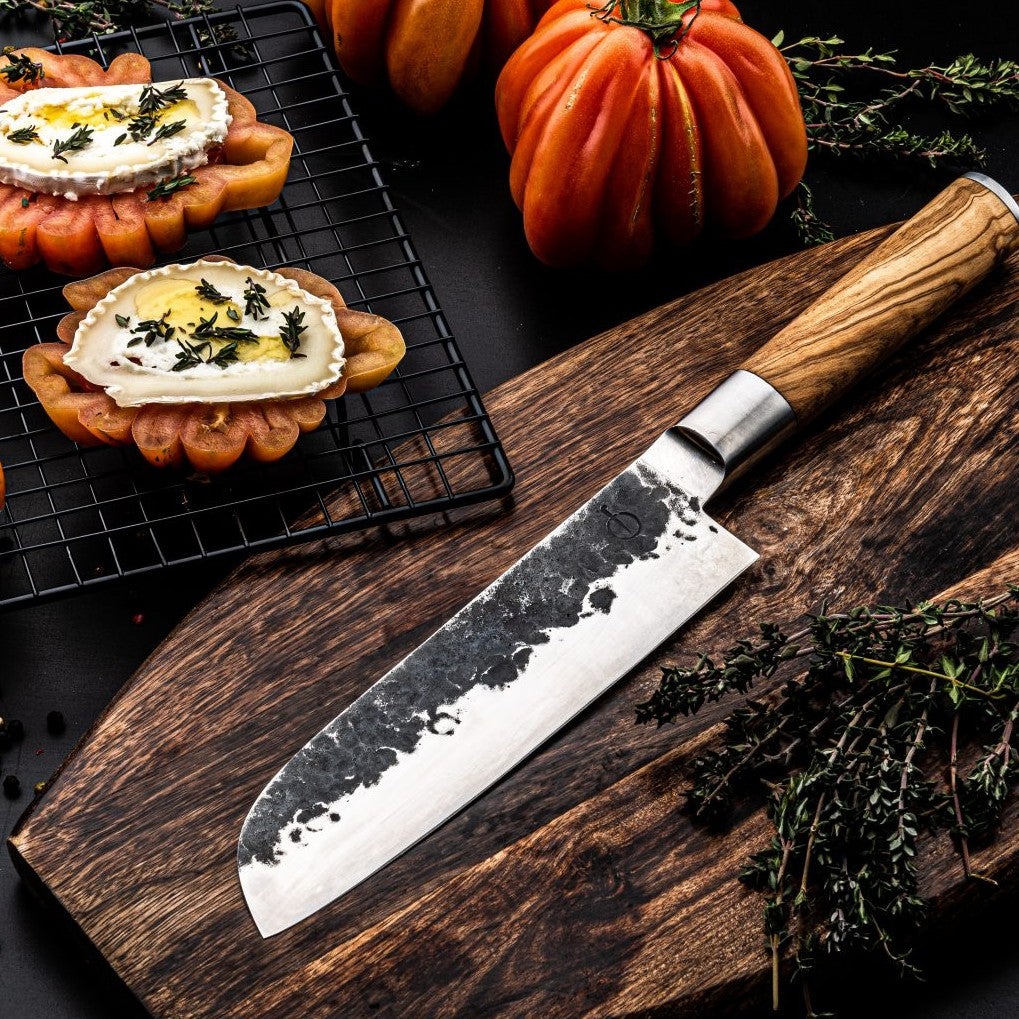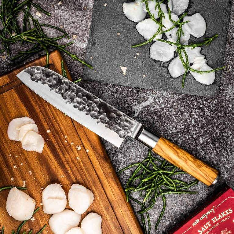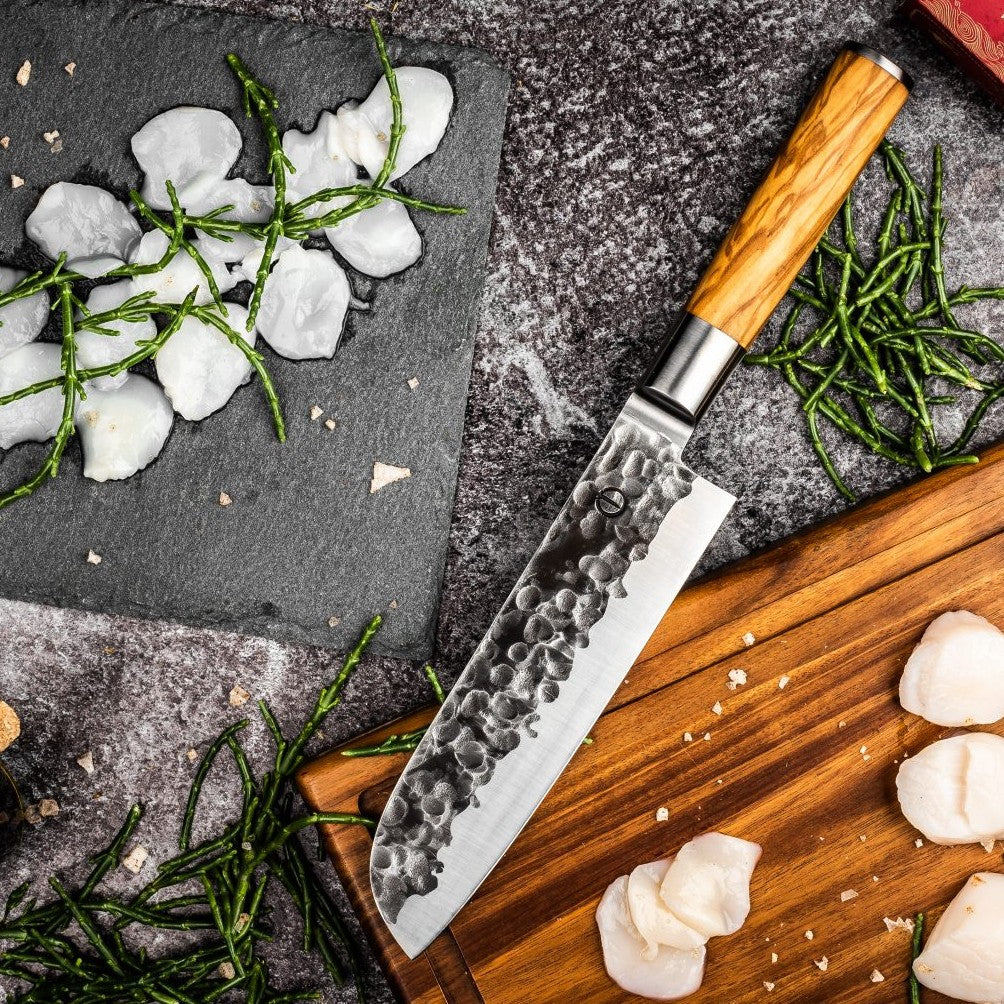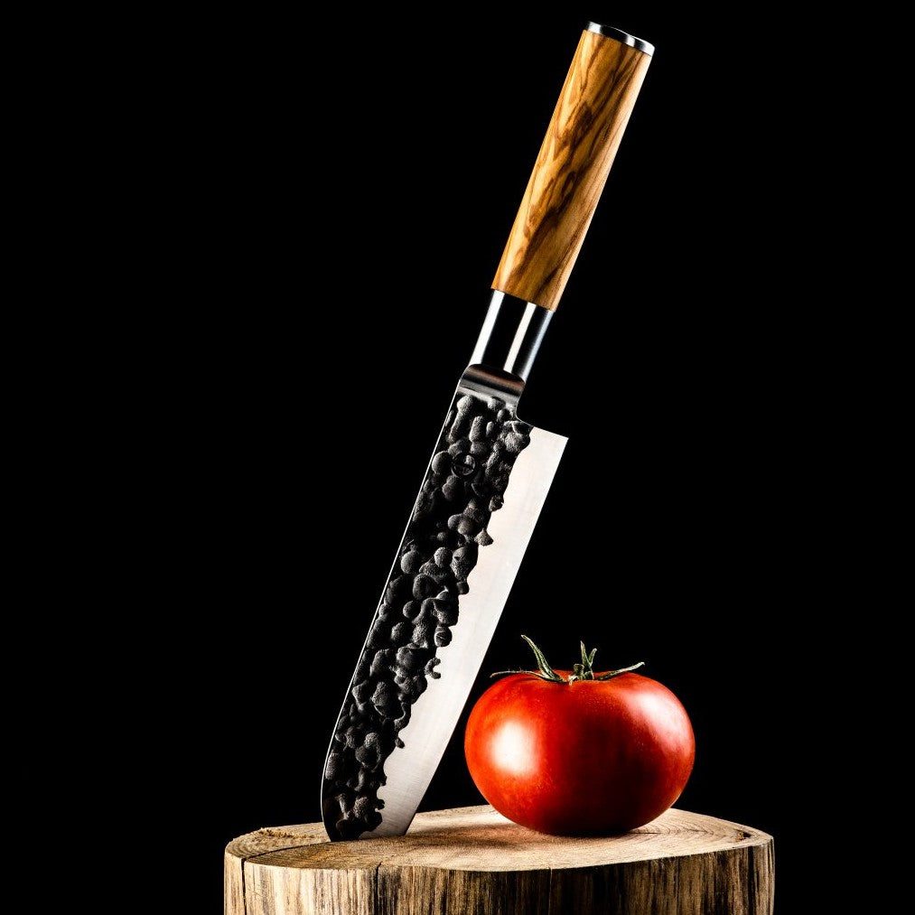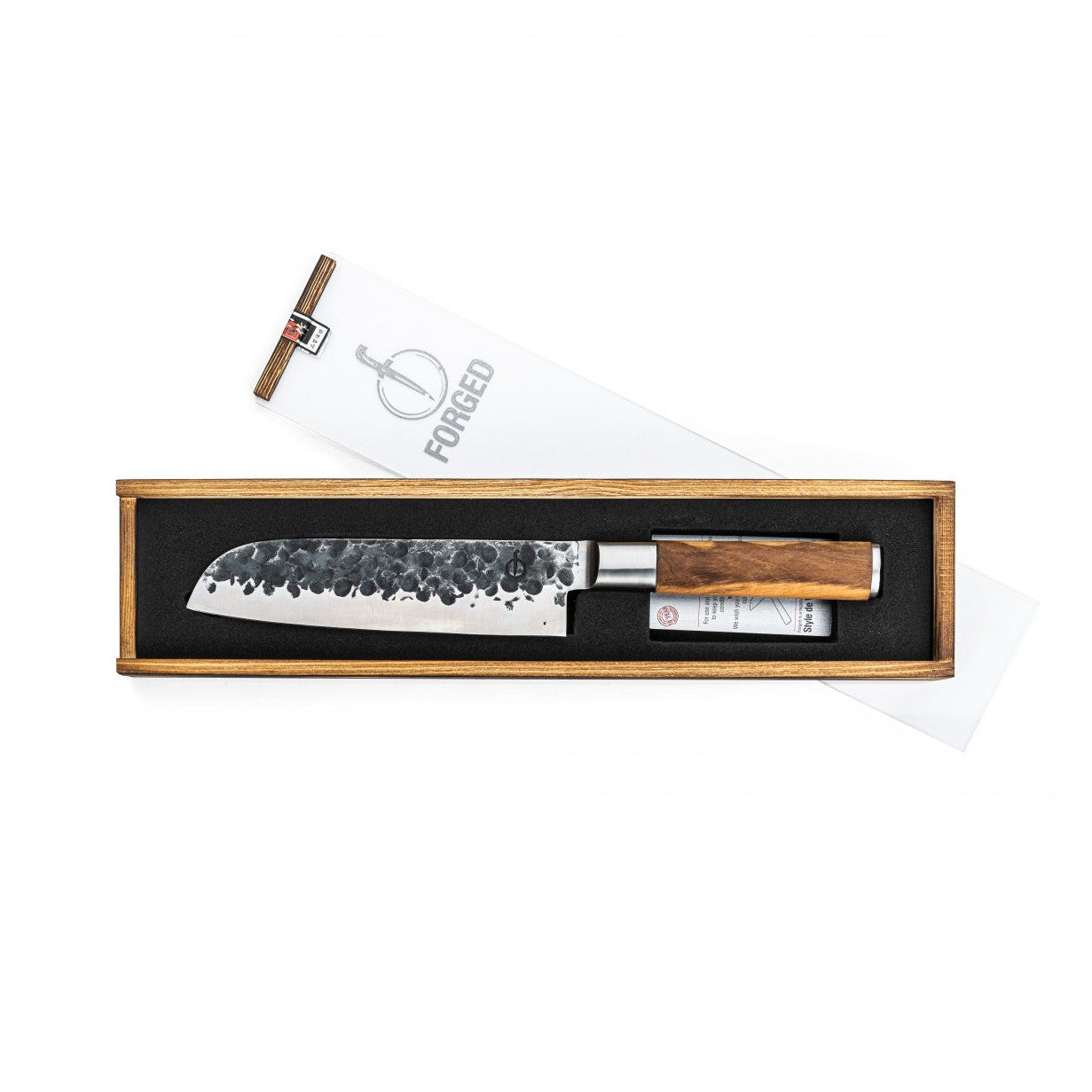 \nForged Olive Santoku-kniven 18 cm är den japanska versionen av kockkniven. Ordet "santoku" betyder "tre dygder", en hänvisning till de tre skärfunktioner som kniven kan utföra: skiva, tärna och hacka. Denna mångfald gör den till en allroundare i köket. Forged Olive-knivarna är tillverkade av japanskt 440C-stål med en hårdhetsgrad på 58 Rockwell. Alla Forged knivar är smidda för hand, har en bladtjocklek på 2 mm och en 18-graders skärvinkel. Kommer i en lyxig låda. Vi ger en 10-årsperiod