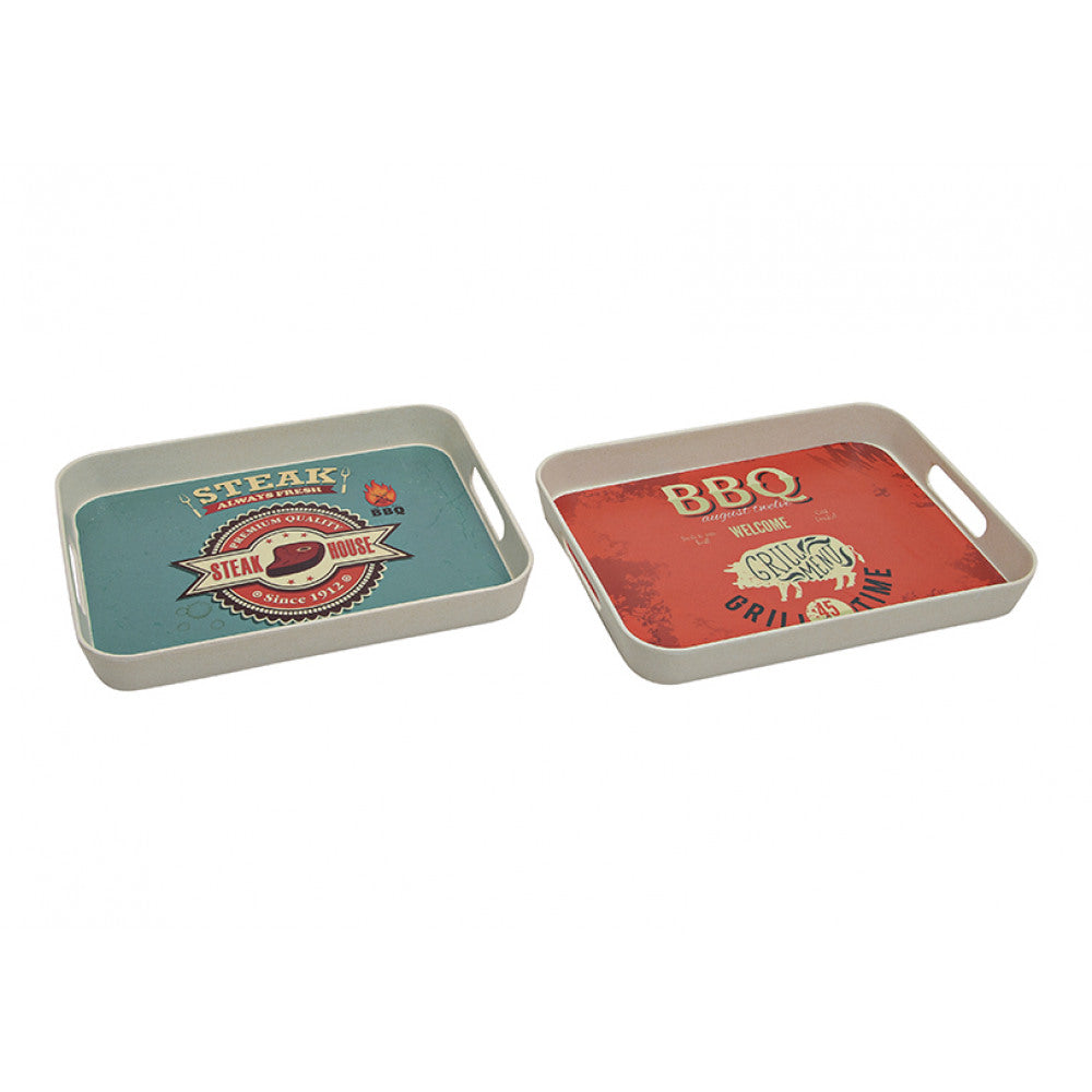 En riktigt läcker bricka med BBQ-motiv. Ska du ha en egen grillhörna vill det till att du kan matcha upp med fräcka tillbehör, detta är definitivt ett av dom.\nVälj mellan röd och turkos.\n33x26 cm och ca 4 cm höga kanter