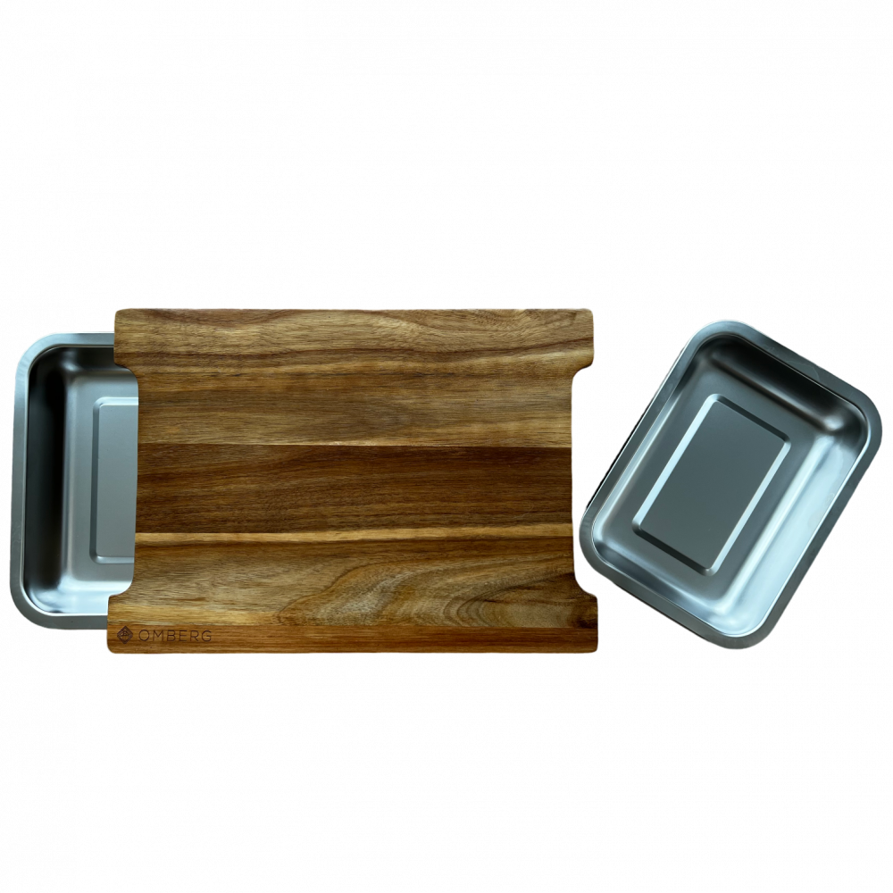 \nRejäl skärbräda med uppsamlingsbleck på undersidan. Oavsett om det är grillat kött du skär upp eller grönsaker på skärbrädet så kan du skrapa ner det i uppsamlingsskålarna som du lätt kan dra ut och in. Det smarta med att skålarna under skärbrädan kan tas bort är att man kan förbereda tillagningen och sedan ställa in det i kylen men också är de snygga att bara ställa fram och servera i.