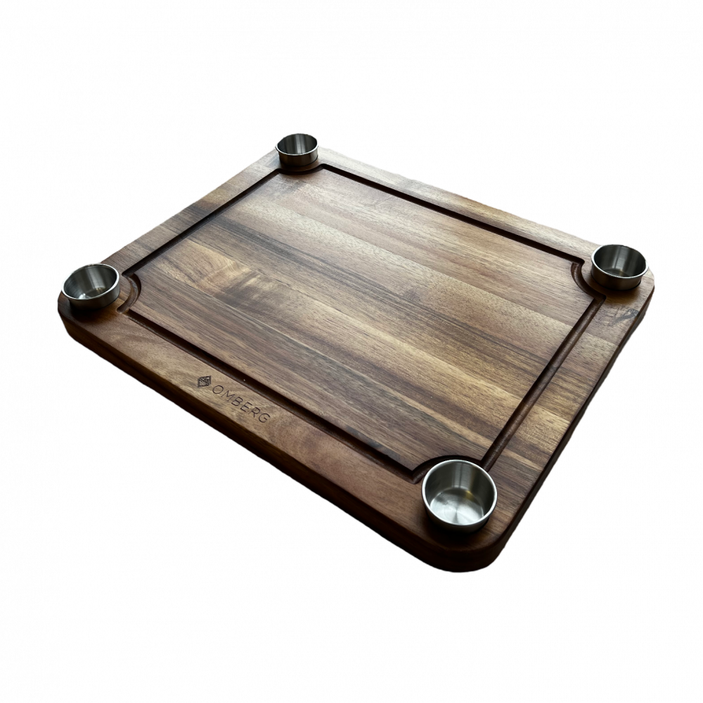 \nMed skärbrädan ingår 4 stycken dippskålar, perfekt att erbjuda dipp eller sås i. Träskärbrädan har dessutom fettavrinning så du slipper få fett eller såsen att rinna utanför.