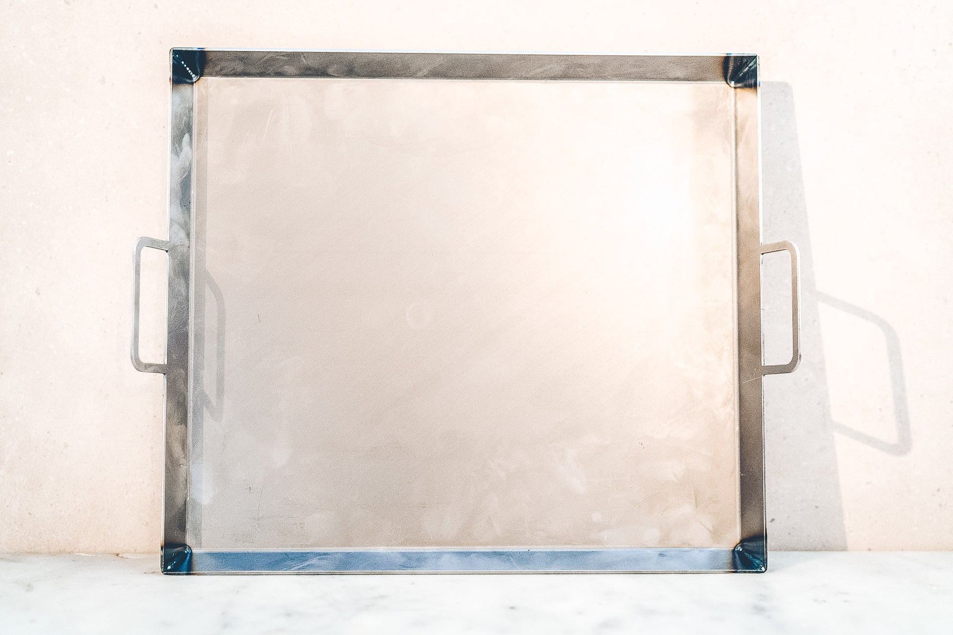 Stilren stekbricka med nätta handtag och svetsade hörn i måttet 30x26cm. Brickan är gjord av 2 millimeter tjock kallvalsad svensk kolstål och producerad i Stockholm.